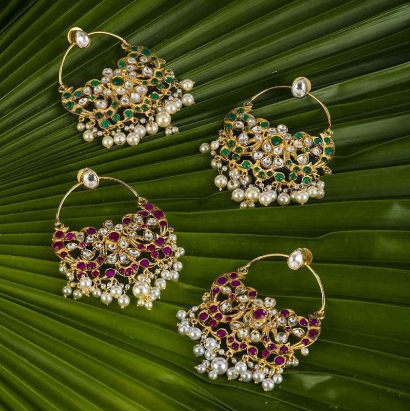 Handcrafted copper earrings with coloured stones and polki stones and pearls in gold polish