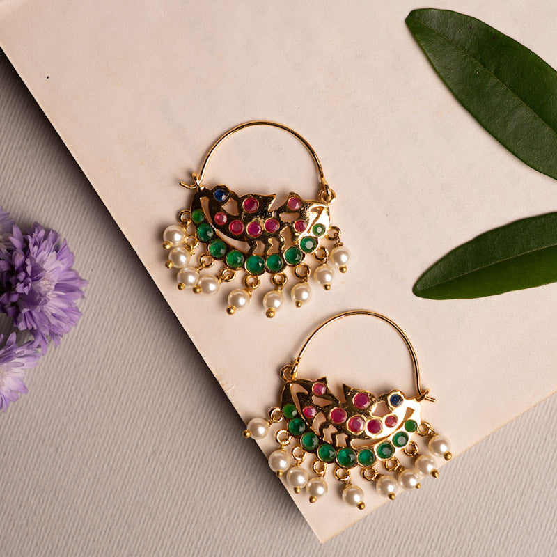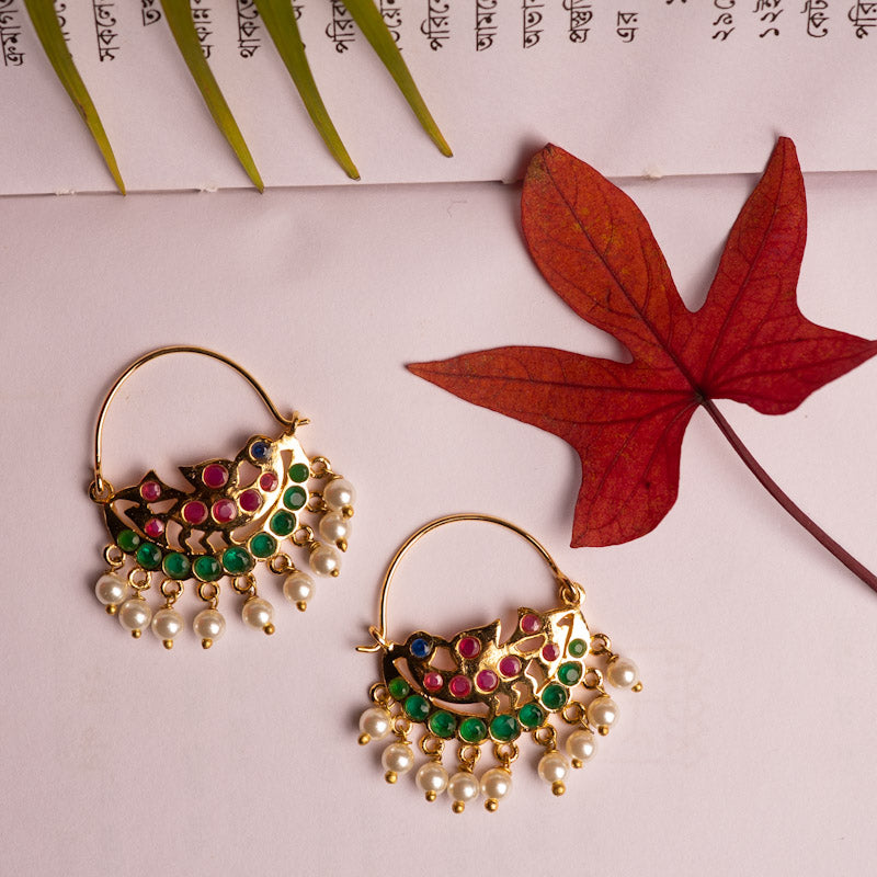 Handcrafted copper earrings with coloured stones and pearls in gold polish