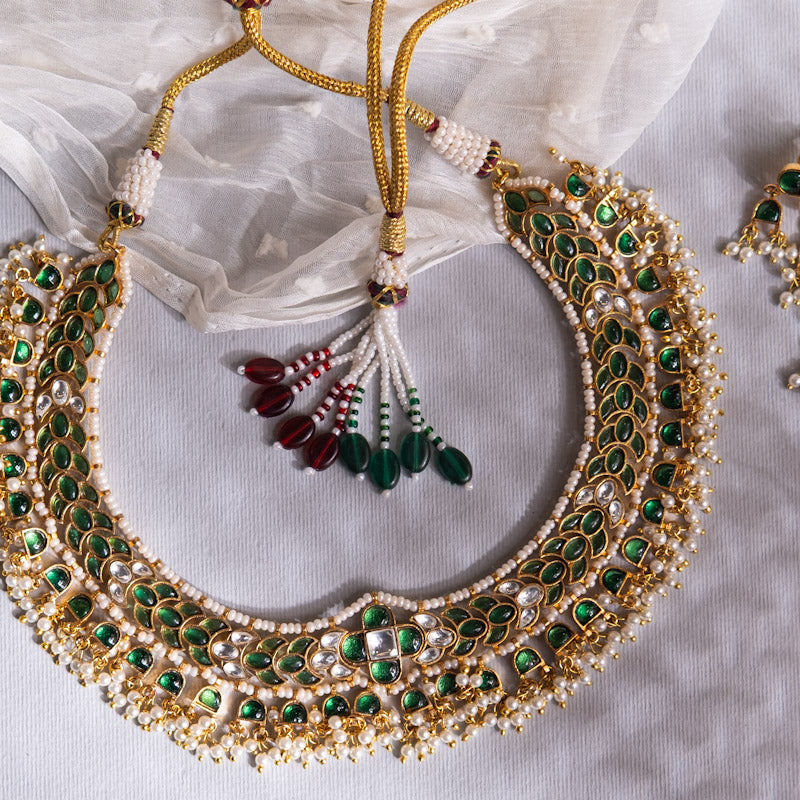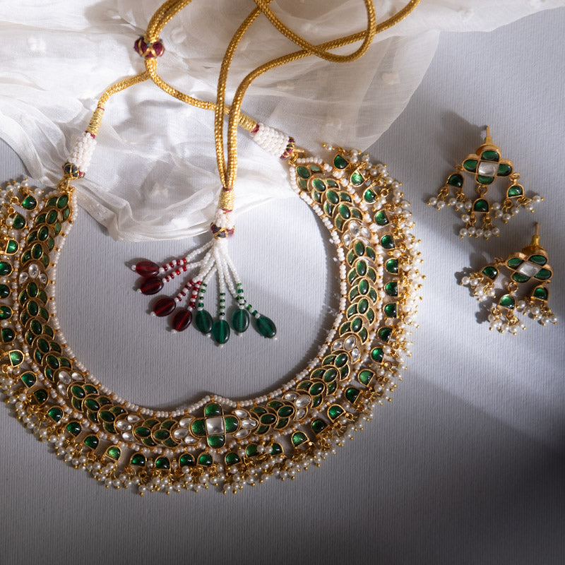 Handcrafted copper necklace with coloured stones and polki stones and pearls in gold polish with matching earrings