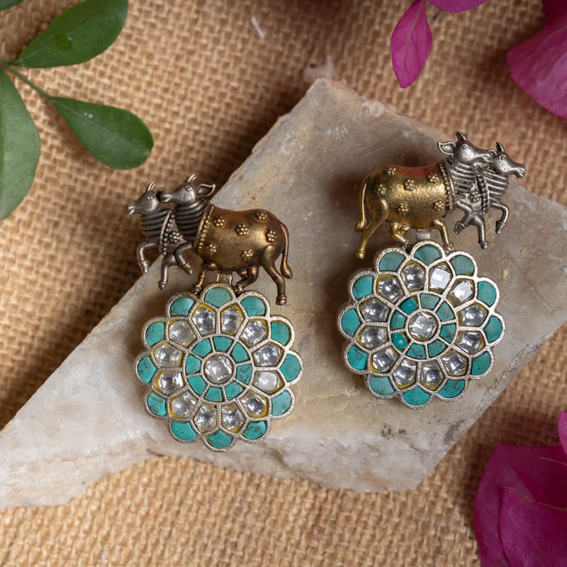 Sterling Silver earrings with coloured stones and polki stones in gold and silver polish