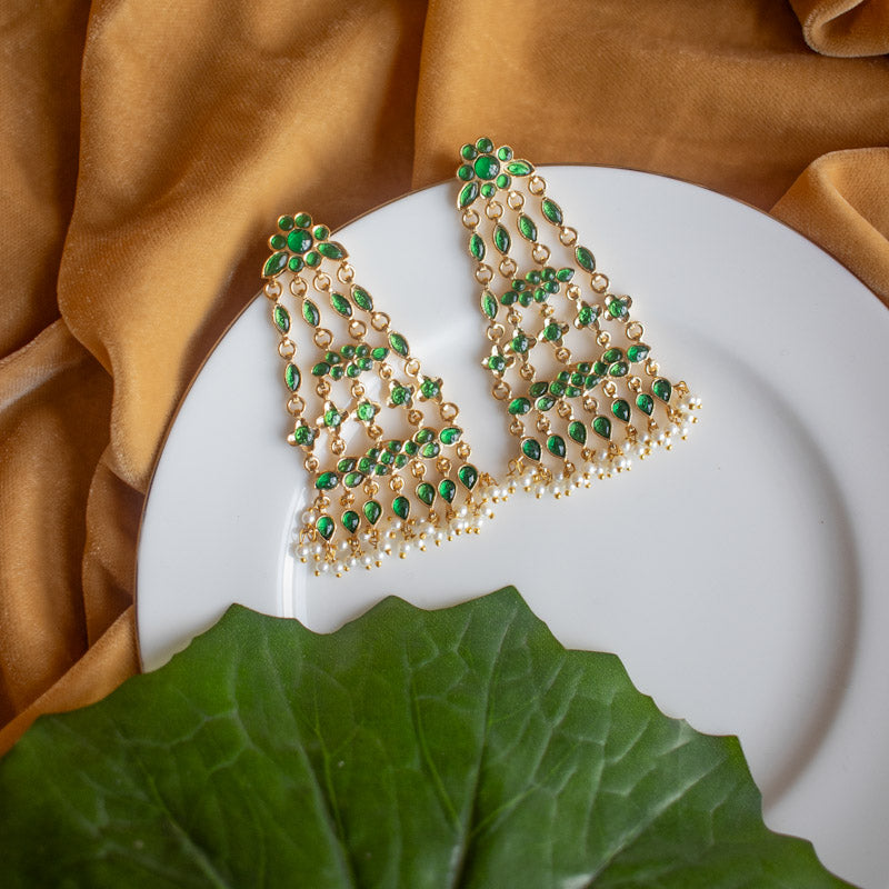 Handcrafted danglers in copper with emerald stones and pearls in gold polish