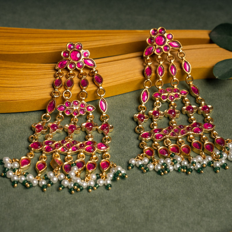 Handcrafted copper earrings with ruby stones and pearls in gold polish