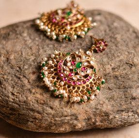 Handcrafted copper earrings with polki and coloured stones and pearls in gold polish