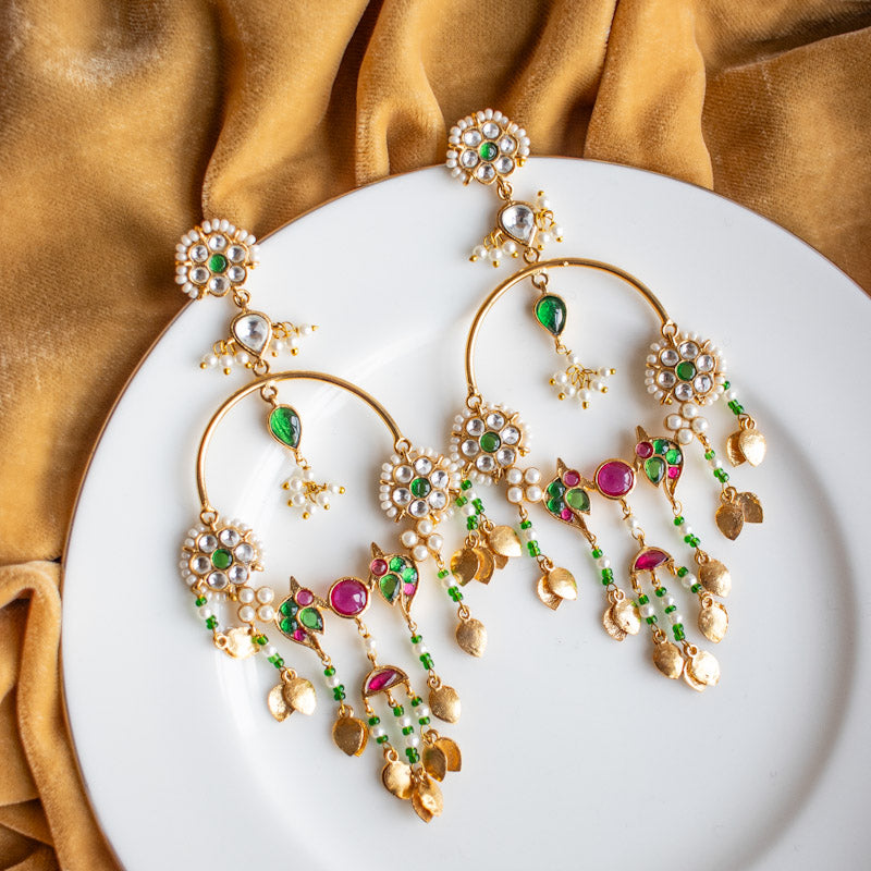 Handcrafted earrings in copper with coloured stones and polki stones and pearls