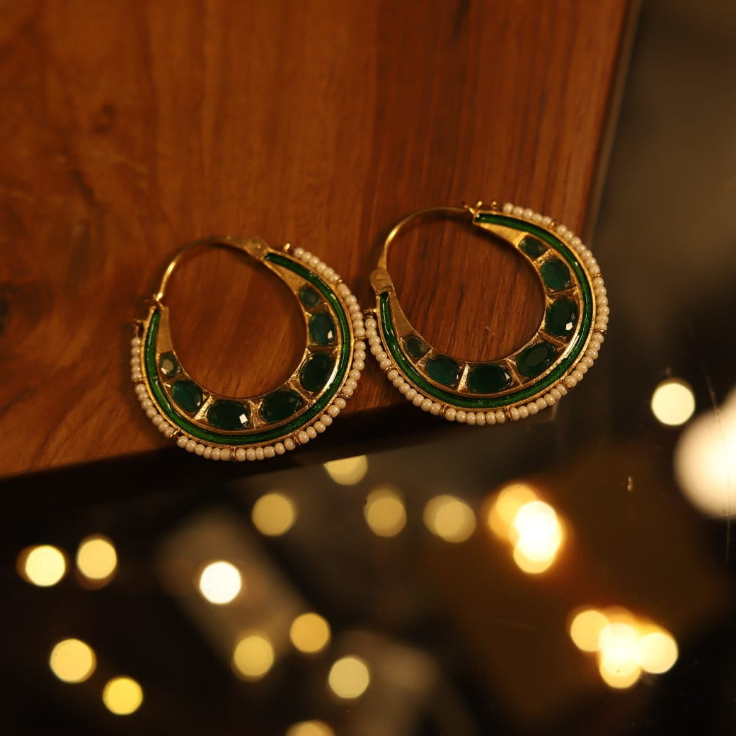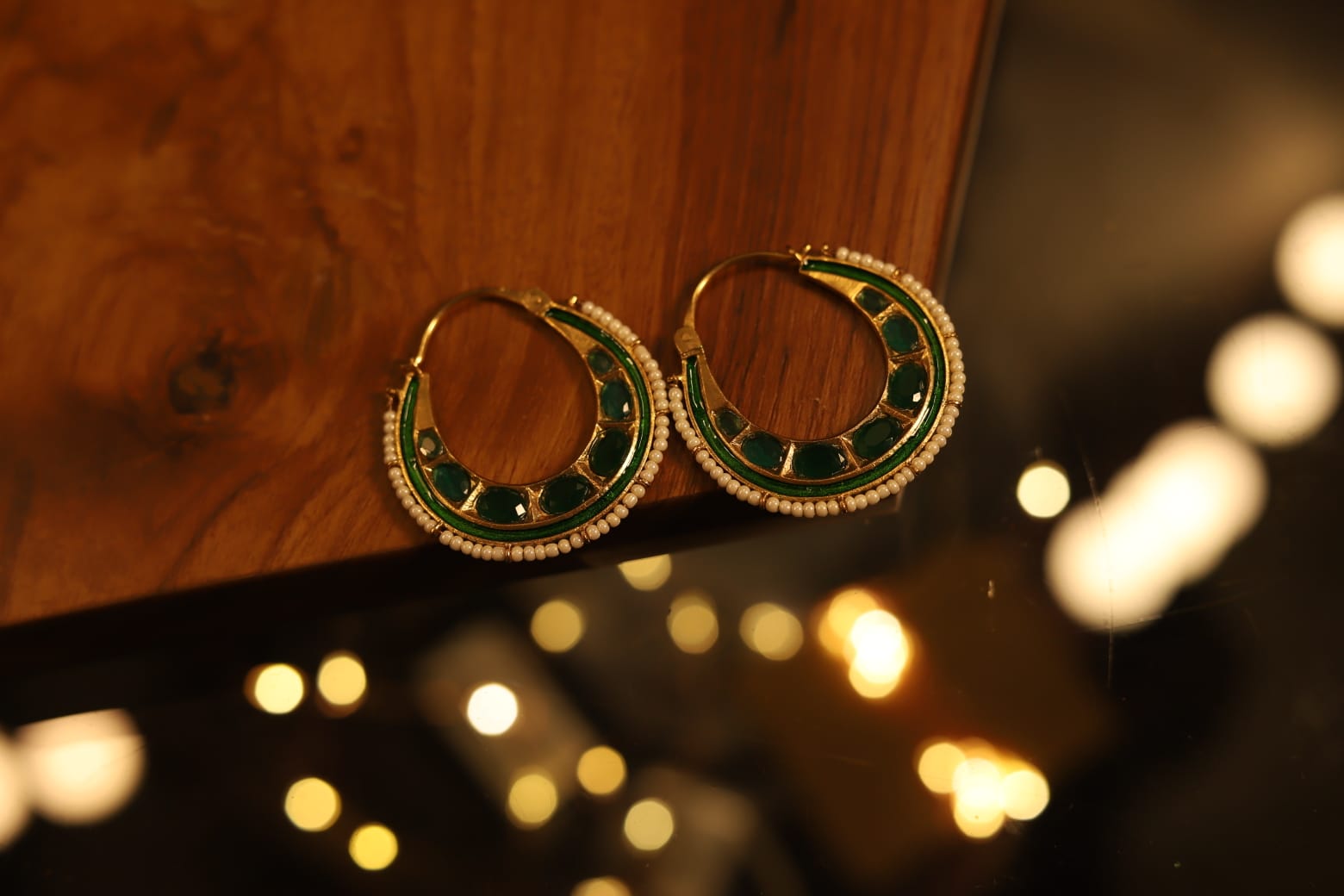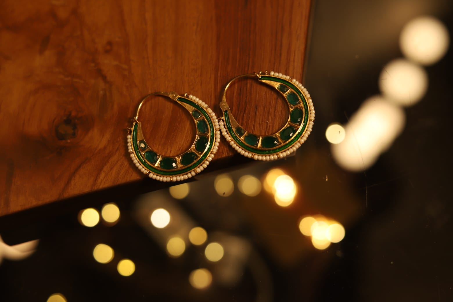 Handcrafted copper earrings in gold polish with tiny pearls and enamel