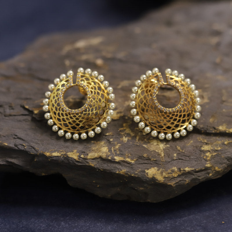 Handcrafted earrings in cooler with stones and pearls in gold polish