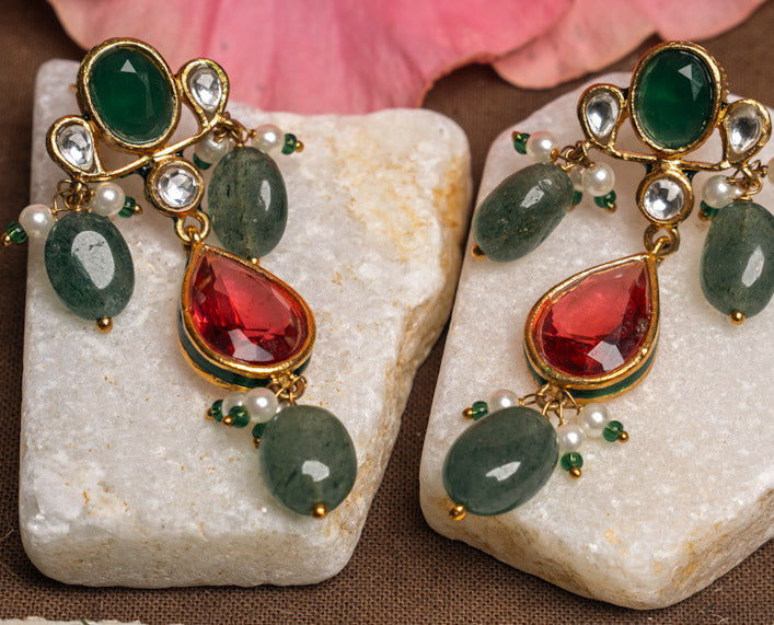 Handcrafted earrings in copper with coloured stones and drops in gold polish