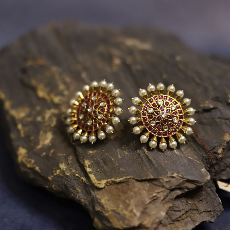 Handcrafted copper earrings with coloured stones and polki stones and pearls in gold polish