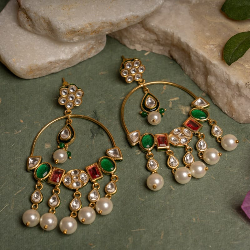 Handcrafted copper earrings with gold polish ,polki stones and coloured stones